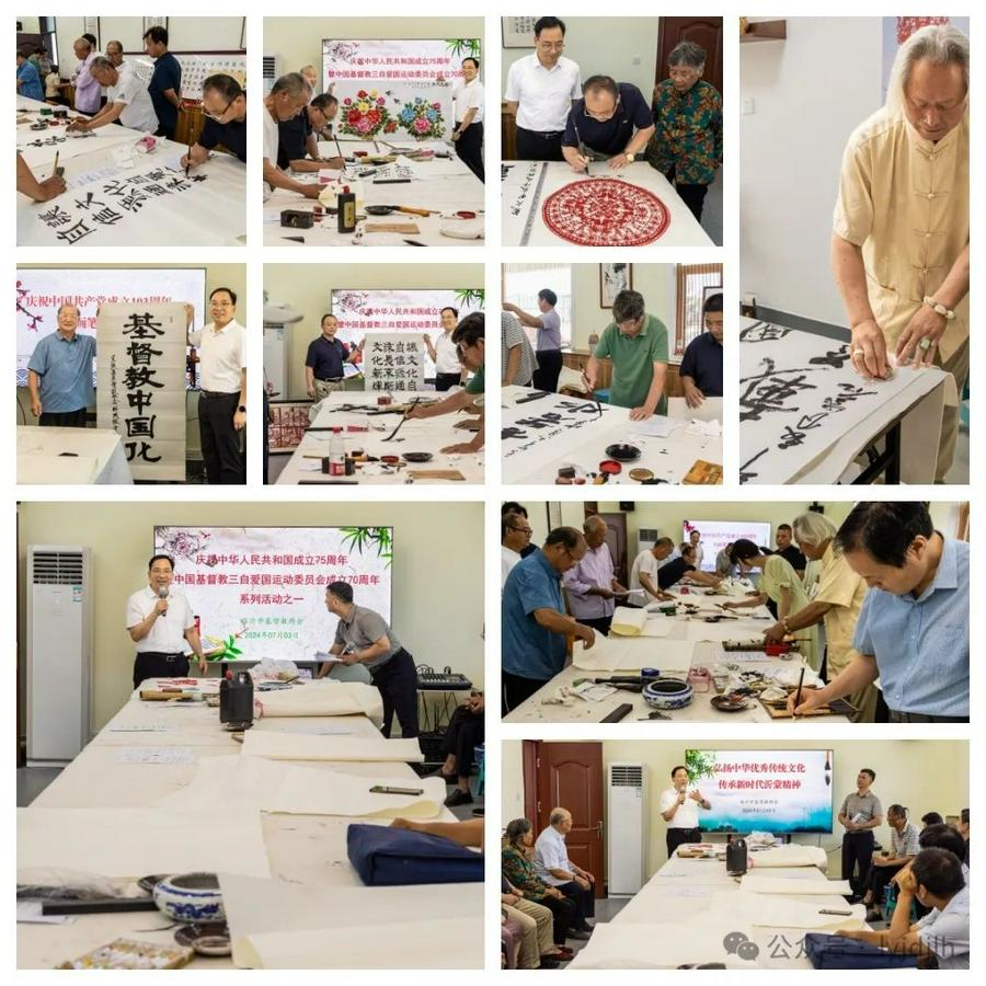 7月3日,中华人民共和国成立75周年暨中国基督教三自爱国运动委员会成立70周年之际,山东省临沂市基督教两会在示范基地四楼临沂市基督教文化艺术中心,举办系列活动之以“弘扬中华优秀传统文化·传承新时代沂蒙精神”为主题的书画笔会交流活动,市基督教文化艺术中心书画界的成员和全市部分知名书画家共二十余人参加。市基督教三自爱国运动委员会主任张建顺牧师,市基督教协会会长刘宗昌牧师出席笔会活动。