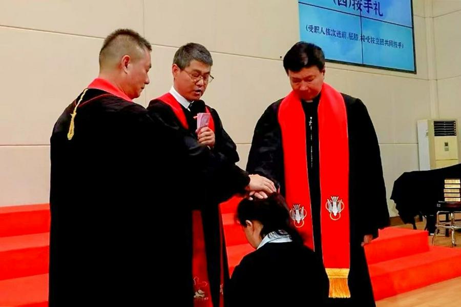 随后,郭云牧师主持了按立仪式,彭成沛牧师向会众介绍接受圣职按立的五位同工的个人情况并给予训勉,黄小波牧师则为被授予圣职的新长老颁授圣带并赠送纪念圣经,按立圣职牧师团及全体弟兄姊妹向每位接受按立成为长老的同工表示热烈的祝贺,李燕长老代表新任长老致答谢词,杨益翰长老为众人做祝福祷告。