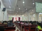 该教堂主体建筑共三层,前段时间刚完成电梯的安装工作。主堂在二楼,此时已经坐满了人。一楼的左侧放有座椅,前面有显示屏,可看到二楼聚会现场的投屏,也坐了不少人。但因右侧是卫生间和厨房,来来往往人比较多,加上外面街道的声音,有些嘈杂。