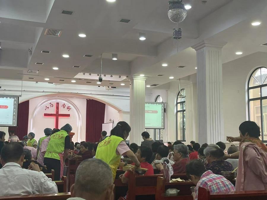 中午聚会结束时,相关人员告知大家先不要离开走动,服侍小组的弟兄姐妹把午饭,碗筷送上来,有的发筷子,有的分馒头,有的盛烩菜,有的给众人端碗,井然有序。负责盛饭的姊妹,不时地走动着,看到有需要加饭的弟兄姊妹就及时帮助他们添加。弟兄姊妹边吃着,边分享着得到的恩典,也关心彼此最近发生的事情。大家有说有笑,场面和谐温馨,让人不禁想起圣经所记:“看哪,弟兄和睦同居是何等的善,何等的美”。饭后,有的人收碗筷,有的人发卫生纸,服侍人员从始至终不急不躁,谦恭有序,用行动践行着神的爱。