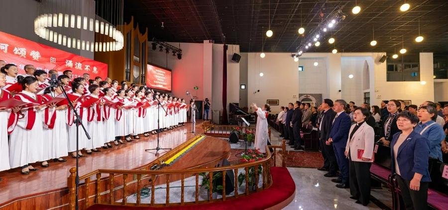 上午10时,基督教中国化圣诗赞美会在朝阳堂主堂举行。唱诗班以“乐河颂赞·涌流不息”为题,呈现了《神工妙笔歌》、《求主福佑中华歌》等八首具有中国特色的赞美诗歌。赞美会在大家齐唱《我和我的祖国》中圆满结束。