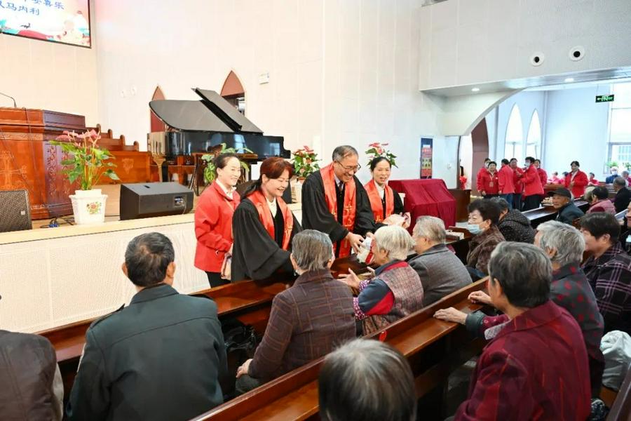 本堂主任倪金礼牧师作节日致辞,向老年弟兄姊妹送上重阳节的问候和祝福。随后,牧师和同工们为70岁以上的老人赠送了节日礼物,代表教堂表达节日关怀和慰问。