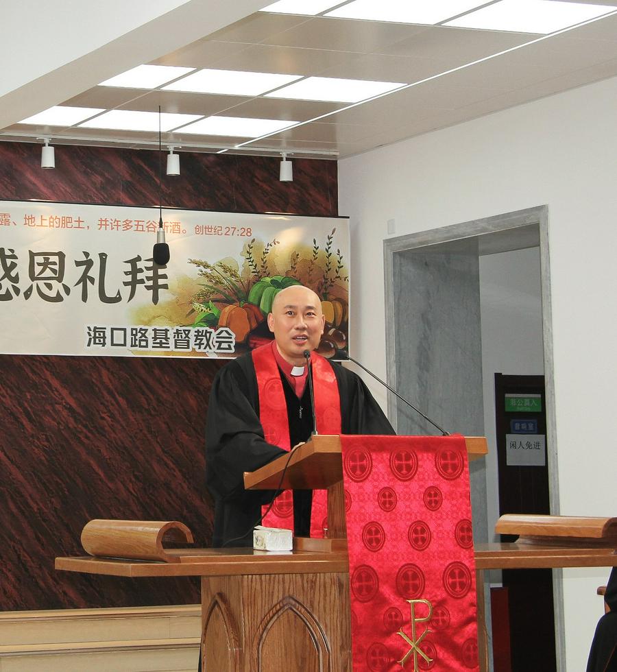礼拜在庄严的圣乐歌声中开始,信徒们跟随张春晓教士的引导,共同吟唱赞美诗新编第184首《收成谢恩歌》,表达对上帝的感恩之情。接着,海口路基督教堂主任闫鹏牧师以“秋成感恩”为题目,与弟兄姐妹展开分享。闫牧师在讲道中介绍了感恩节的来历,强调了感恩的重要性,提醒大家要珍惜生活中的每一份恩赐,并告诉我们当如何感恩:第一,要欢乐感恩;第二,要奉献感恩;第三要永远感恩。