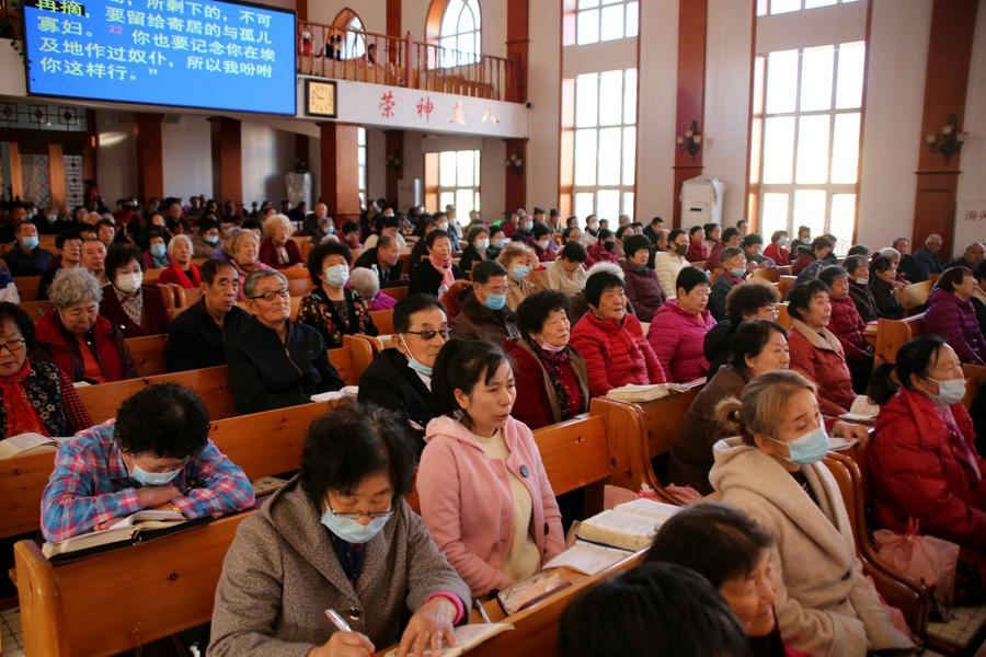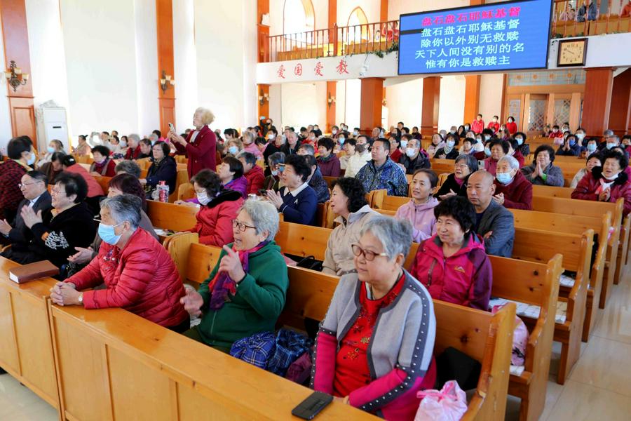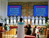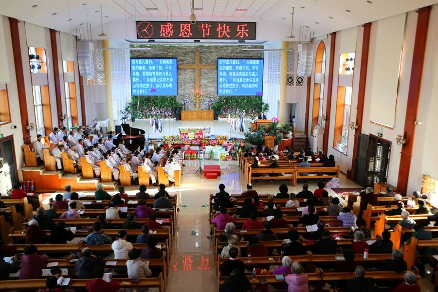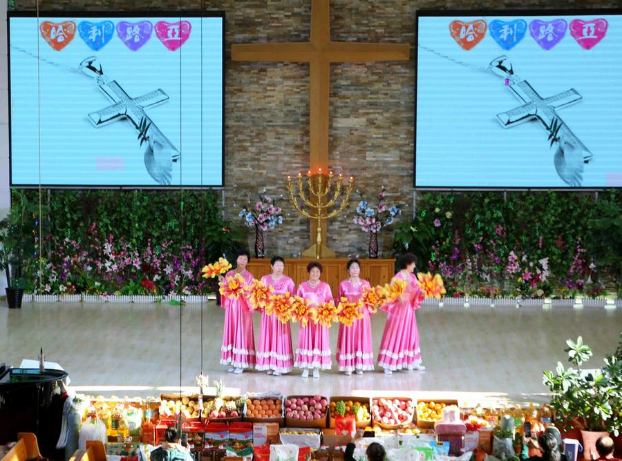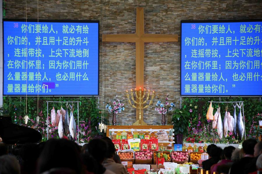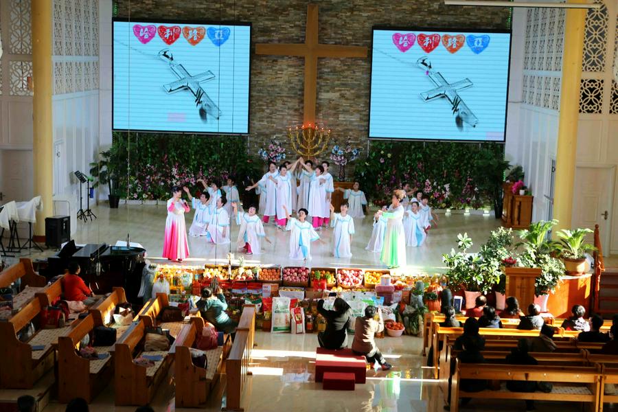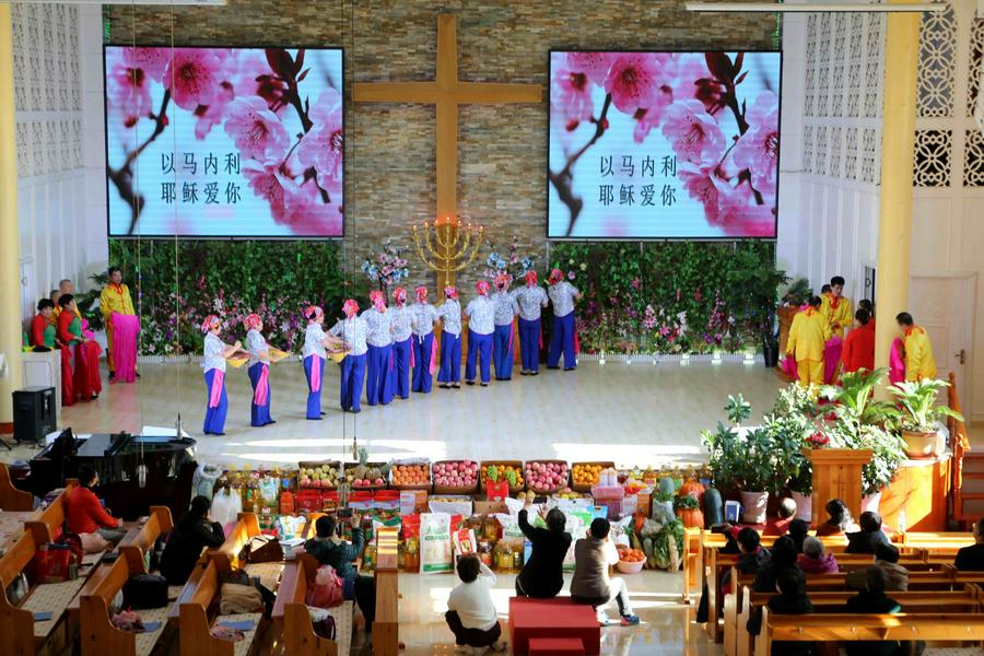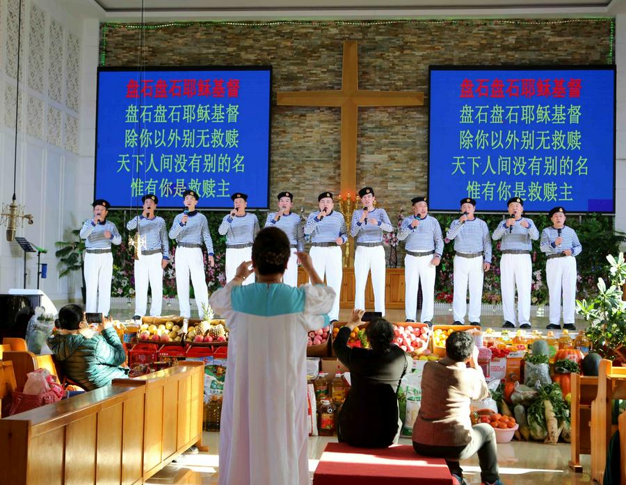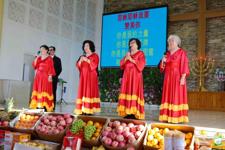 今天的水师营教堂主堂充满着节日的喜乐氛围,圣台前摆满了信徒们感恩的祭物:渔民弟兄献祭的几条一米多长的大鱼;苹果、柿子、南果梨等水果;村民弟兄姊妹献祭的大南瓜、冬瓜、白菜等蔬菜;大米、白面、食用油等米面粮油祭物。这些献祭之物不仅是他们劳动的成果,也是对上帝恩赐的感激之情的象征,充分显示了父老乡亲信徒的感恩之情和爱主爱教之心。