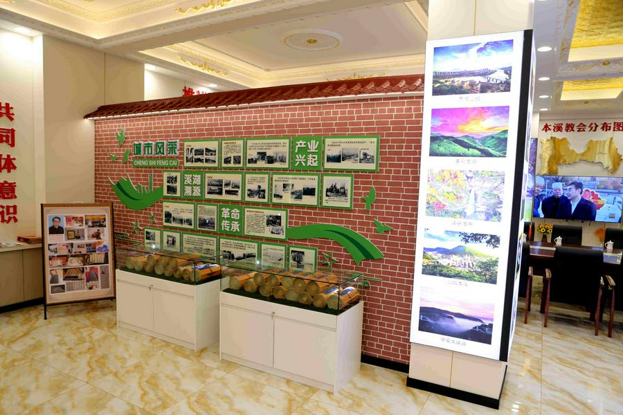 展览馆的规模宏大,总面积广阔,有300多平方米,分为四个展厅。“法律法规”展厅:强调基督徒要学法守法,自觉履行公民义务,守法必须先学法。培养信教群众有国家主人翁意识,形成正确的法制观念,维护自身合法权益,维护基督教遵纪守法的良好社会形象。“党建党史”展厅:展示了中国共产党百余年的历史丰功伟绩,不忘历史,继往开来。“民族民俗”展厅:本溪是一个历史悠久、多民族的城市,有包括汉族、满族、回族、朝鲜族、蒙古族、锡伯族等四十多个民族大家庭,展厅用图文的形式展示了这里的民族民俗。“基督教中国化”展厅:这里我们可以看到中国基督教的“三自”发扬爱国主义传统、建设好教会的总原则,也是中国基督教独立自主自办教会的根本原则在本溪的落地生根,包括本溪市所有基督教活动场所的布局、历年来所荣获的各种荣誉、本溪市基督教两会和各个堂点的各种丰富多彩的活动等。