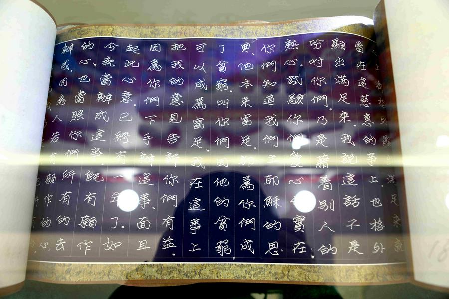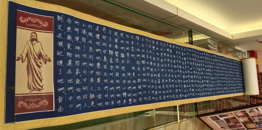 在这里,最引人注目的是中国硬笔书法家会员、辽宁书法家协会理事、中国书画艺术研究院副院长、平艺坊书画院院长蔡和平先生的圣经书法长卷。蔡先生从上世纪八十年代初开始用书法形式手抄中外名著,是中国第一位用不同字体抄写《红楼梦》《水浒传》《西游记》《三国演义》的首书者。他耗时六年多,每天用七、八个小时抄写圣经。他抄写的圣经与众不同:第一是长卷(二千六百余米),是目前世界最长度的手写本圣经;第二是用特定制的、稀有的“万年蓝”宣纸上书写、以白色的调料书写,彰显基督教蓝色的尊贵,蓝底白字特显圣经的荣耀;第三是集他四十多年的书法的造诣和功底,将魏碑体、隶书、行楷等多种字体有机地融为自己特色的“蔡体”,是非常难得的、珍贵的、唯一的,有收藏价值和观赏价值的书法家手抄本长卷圣经,目前正在申报吉尼斯纪录。