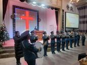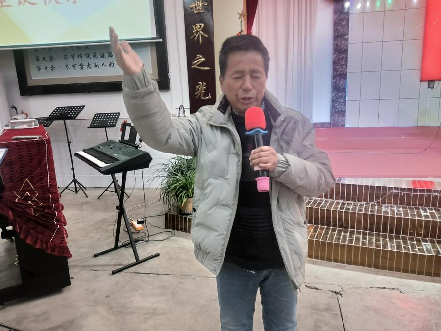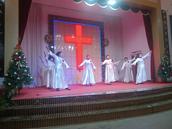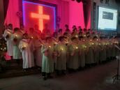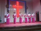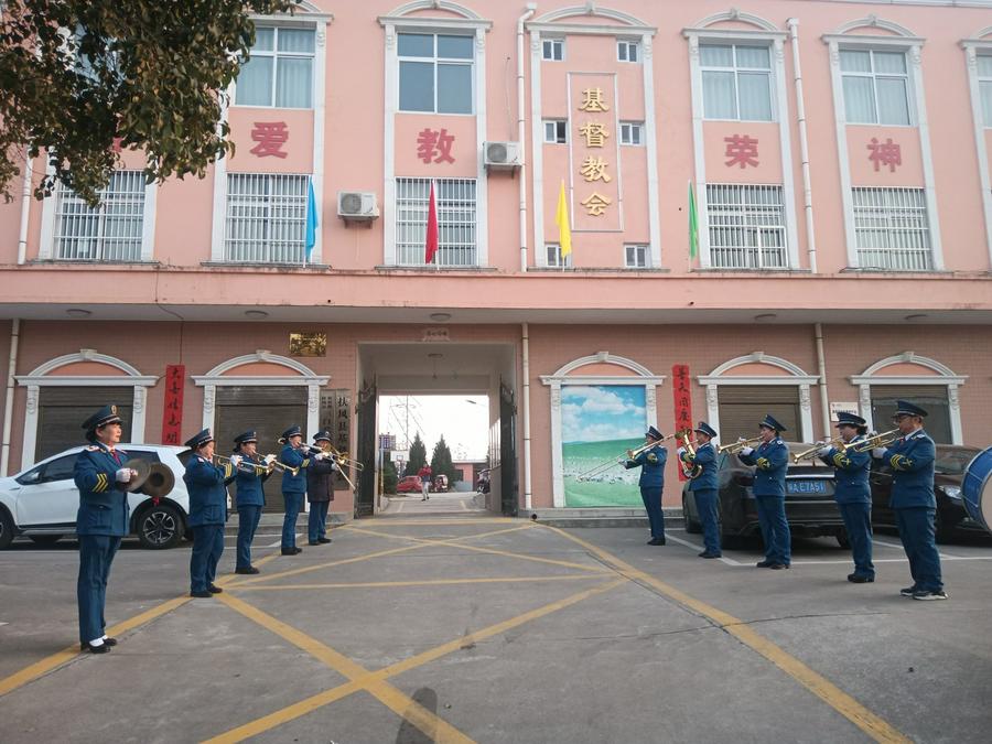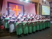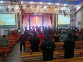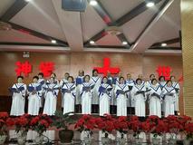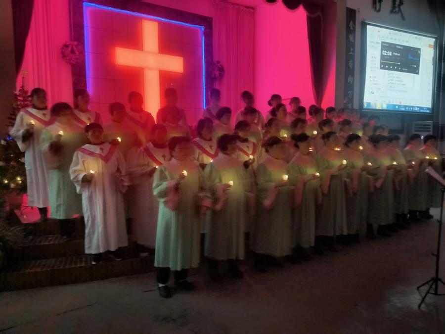 在这个时候,当你刚好来到教会大门口,会看到教会圣乐队已分站两旁,他们身着统一队服手执萨克斯,当见有客人出现,他们马上演奏起赞美诗歌欢迎你。客人一波又一波来到,他们一波又一波的以这种方式欢迎。当你在一首首赞美诗旋律伴随中走进主堂,里面已是灯壁辉煌歌声如潮。台前东侧已有两位姊妹,一人弹琴一人教唱赞美诗歌。《主如明亮星辰》《耶稣真爱你》两首赞美诗歌如同放飞的白鸽,在主堂上空自由飞翔……