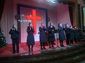只见这时全场灯光渐暗,主堂北入口处分别站立的诗班两列队伍亮起了手中烛光。在平安夜音乐旋律中,缓慢沿东西两条走道朝前台步来。待诗班台前站好队形,烛光熄灭全场灯开。随后在音乐伴奏下,诗班弟兄姊妹放声献唱了《荣耀归神》《牧羊人之歌》。紧接其后是乐队萨克斯号手在鼓镲点敲配合下,激昂欢快演奏了《欢乐佳音》。随着音调旋律减缓,继续演奏了《圣夜静》。