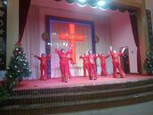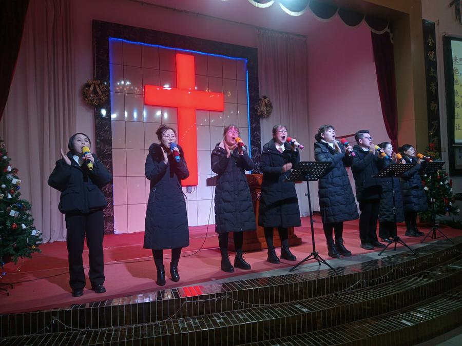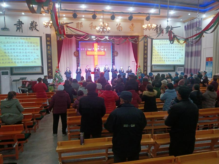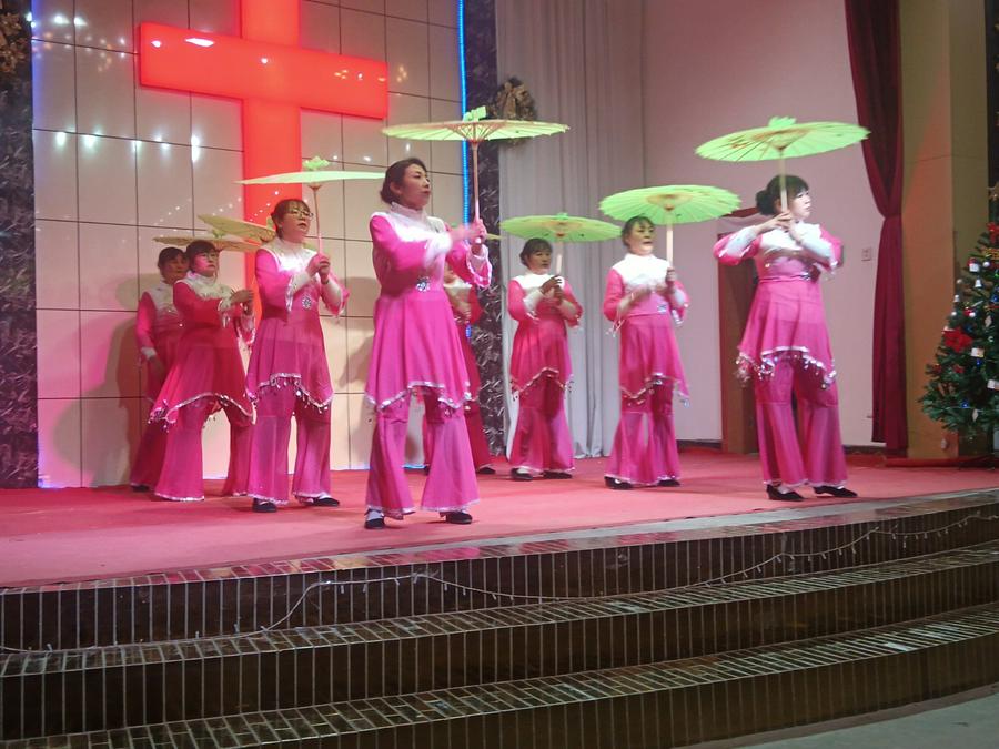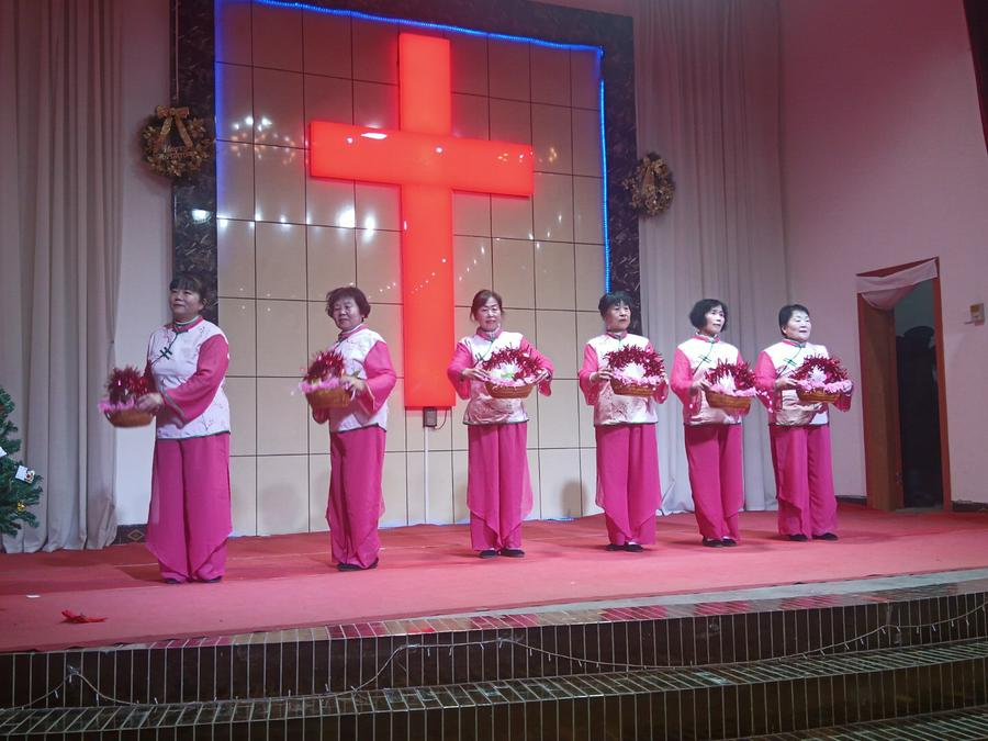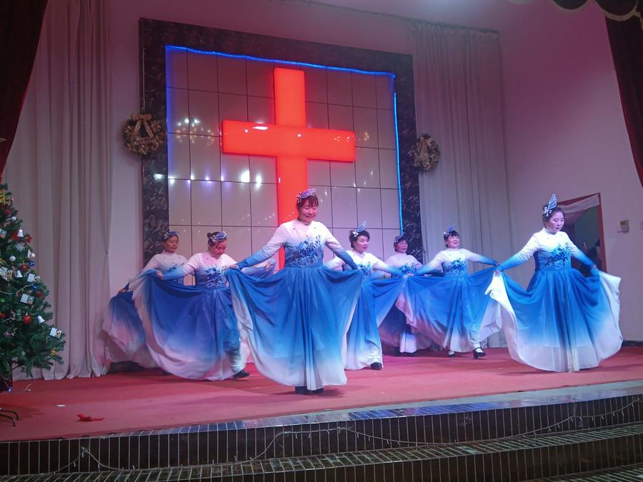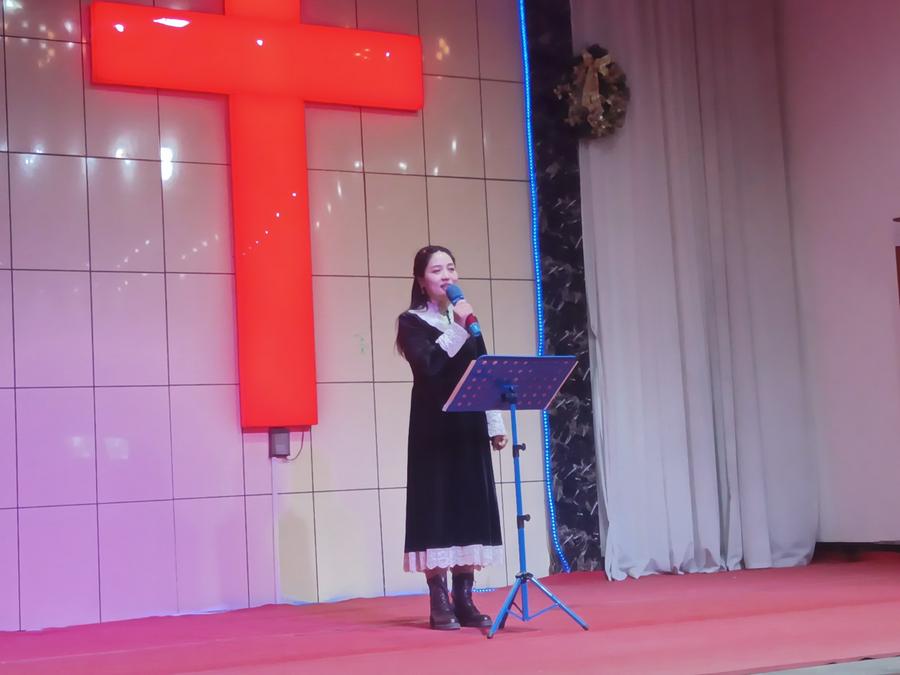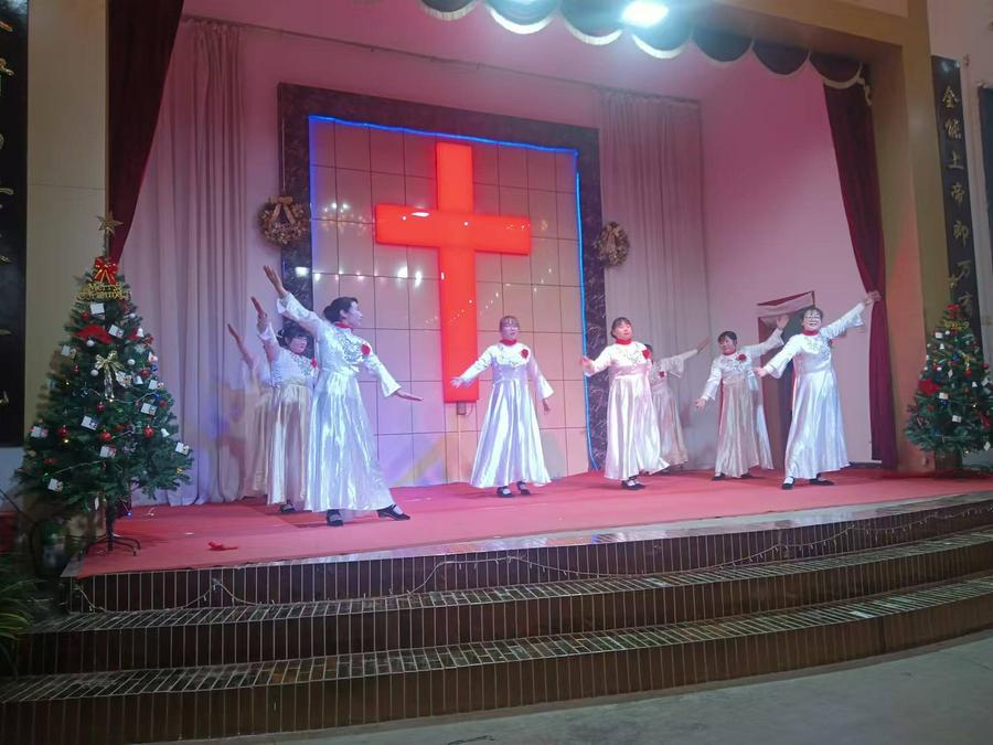 证道结束后,开始了平安夜圣乐崇拜。教会两个诗班和圣乐队预备了二十个文艺节目,在主持人依次报幕中有序登台演出。一个圣剧《伊甸园》,一个歌伴舞《想起你》,两个诗朗诵《圣经各卷中的基督》《耶稣——和平之君》,十六个身着各族服饰的精彩舞蹈,如同十六朵喜乐的浪花接踵而来:《迎接喜年来》《最美的爱恋》《一天七次赞美》《丰年的时候预备荒年的粮》《万物诉主恩》《主的恩典丰丰满满》《热情的新郎我爱你》《尽情赞美主》《赞美主耶稣》《生命的建造》《藏族舞——梦中的天堂》《黎族舞——我在茶山赞美主》《蒙古舞——天堂赞歌》《伞舞——恩典之路》《新疆舞——伯大尼的马利亚 》《现代律动舞——如果上帝没有帮助你 》……