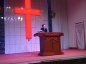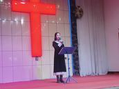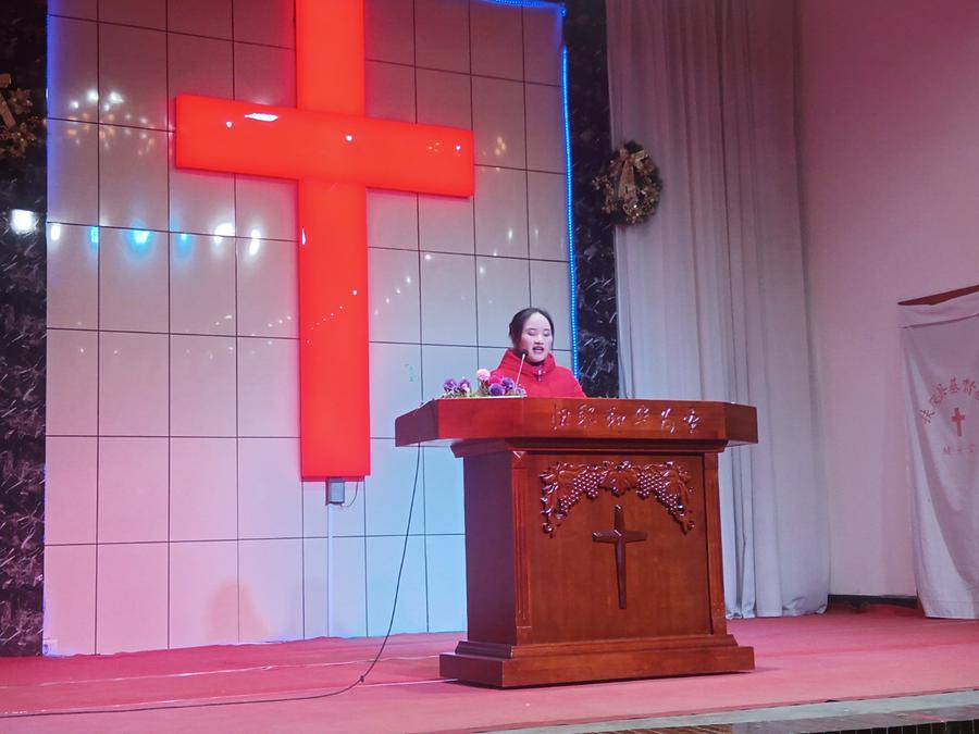 接下来,是邓菊妮姊妹的一堂证道。在开场白中她说,今天是平安夜,我们一同来到主面前,共同欢庆,共同赞美。祂是为我们而生,带给我们从神而来的平安。我们每个人都渴望得到平安,但只有在主里才会得到真正的平安。然后邓姊妹以圣经(路2:14)经文为依据,围绕“平安夜里有平安”主题,讲了三部分。一、你要认识神就得平安;二、平安归于祂所喜悦的人;三、我们向神祈求平安。