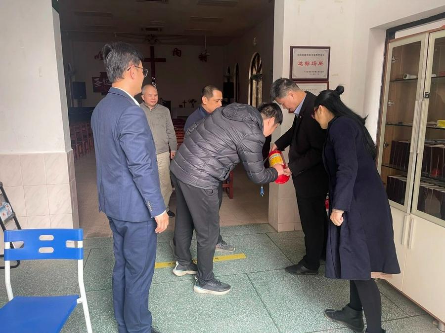 为进一步落实《广东省民族宗教委关于进一步做好2025年元旦春节期间安全生产工作及自然灾害隐患排查整治专项行动的通知》有关要求,确保春节期间全省基督教领域的安全稳定,2025年1月9日至10日,广东省基督教两会常务副主席兼常务副会长许洁平牧师、省基督教协会总干事杨永纯牧师赴云浮市新城堂、湛江市雷州雷城福音堂、阳江市阳东堂开展春节前安全巡查及春节慰问工作。