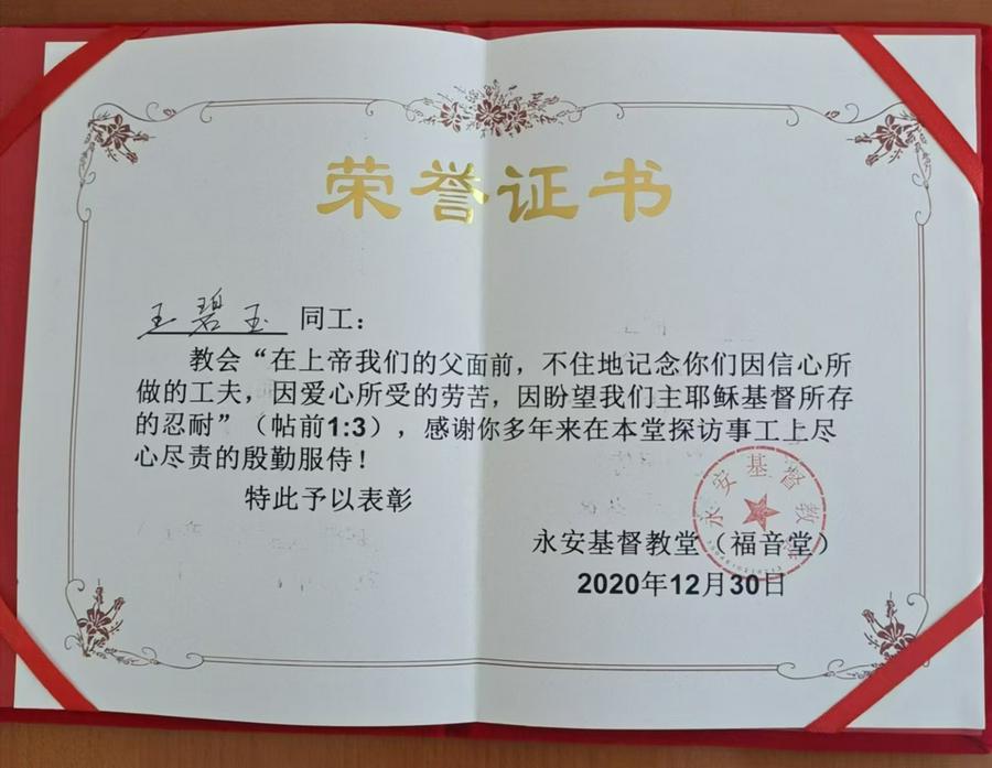 虽然身边的人都不知道哪里有教堂,但她始终没有放弃寻找教会的念头,而且心思一天比一天迫切,时常为此事祷告。感谢主,几个月后的一个星期天清晨,她在家门前看到从远处走来两个姐妹,每人手中拿着两本书。当她们走近时,她看到她们手上拿的是圣经和诗歌集,此时仿佛在黑暗中见到了光明,碧玉姐妹急忙赶上前问:“你们是去做礼拜吗?她们脸上洋溢着热情的微笑,说:“是啊,你去吗?”从此,碧玉姐妹如同流浪的孩子找到父母,回到了家里。