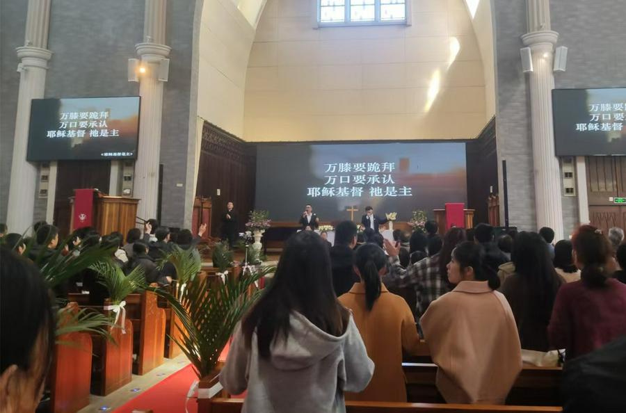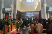清脆的殿乐响起,装饰着棕树枝的苏州独墅湖基督教堂里的会众都安静了下来,教堂内呈现出神圣的氛围。主礼同工宣布崇拜开始后,4月13日上午第二场的棕枝主日崇拜拉开了帷幕。