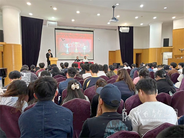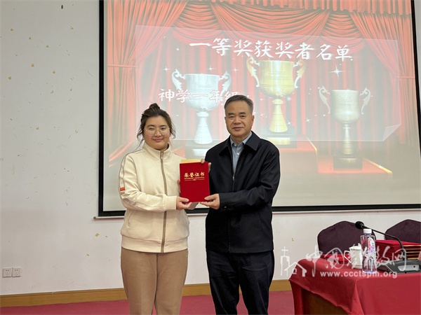 教务处董郑立老师宣读名单,获奖同学依次上台领奖,在热烈的掌声中,谢炳国牧师为获奖同学颁奖。神学本科四年级洪毓豪同学代表获奖者发表感言,并与大家分享了自己的学习心得。