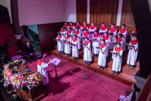 张耀波牧师主礼洗礼仪式,随后天恩诗班献唱赞美诗《开心门让耶稣进来》。