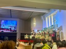 七时整,序乐准时响起,身着洁白圣袍的诗班成员神情肃穆,缓步进入圣堂,整齐列队于圣台中间,瞬间将现场带入庄重的崇拜氛围。崇拜以牧师庄严的宣召正式启幕。随后诗班献唱经典圣诗《大卫城中》,当歌声行进至第三段,指挥转身面向会众,全体会众起立同声应和。