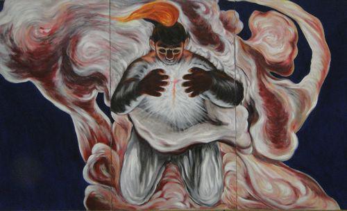 王增瑞牧师的《面对自我》意在表达在神面前没有包装,没有隐藏,没有遮蔽,没有虚伪,完全打开心面对上帝,当我们打开心的时候,十字架照亮我们内在的世界。周围的浮云象征着神的同在,头上的火象征着圣灵的火焰。这个展览是主题是“第三天”,第一天是钉十字架,是死亡和黑暗,第二天是在埋葬中,这幅画是在第二天的埋葬当中,属灵含义就是面对自我当中,第三天是复活,面对自我之后有丰盛的生命。