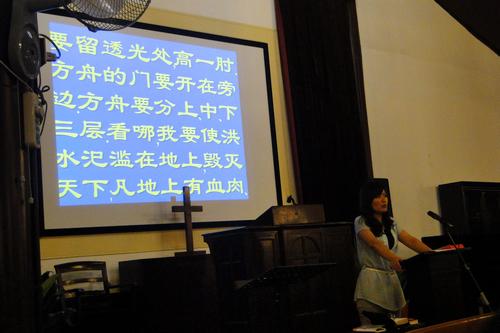这次聚会有超过50人参加,刘燕教士以“挪亚是圣经中第一个被上帝称为在他眼前蒙恩的人”开始分享。接下来分别通过“挪亚是那个时代的完全人”、“与神同行的挪亚”、“挪亚造方舟”和“诺亚的信心”四个主题来具体讲解了挪亚在洪水前的故事,并指导信徒现实生活。