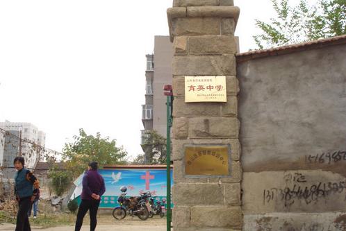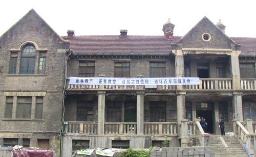 泰安百年教堂由英国人建立,地契在英国人手中,开发商正在拆毁,盖金旺铺拍卖销售。网友“多峰多岭的人生”介绍:被非法拆毁的原本是一体建筑,现在被分割三处,被拆的院墙是东面的(英国百年建筑育英中学)现基督教堂,拉白色横幅的是西面的。拉着白色横额的教堂古老建筑,院墙已经被拆毁,此楼已经危在旦夕。