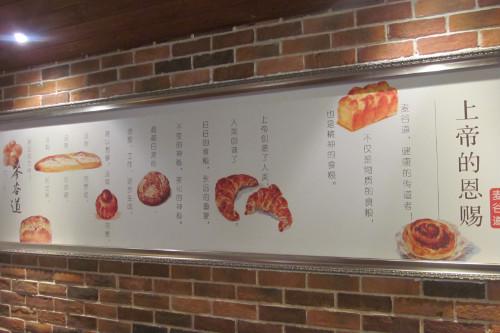 在麦谷道的店内墙上,印着这样一段诗话:《上帝的恩赐》麦谷道/是健康的传道者/面包不仅是物质的食粮/也是精神的食粮/上帝创造了人类/人类创造了面包 /日日的食粮/永远的重复/不变的神秘/变化的神秘/超越日常的面包/使爱、工作、进步生成/为使人类生存而解放人类/难以想象/没有面包的爱/没有面包 的劳动/没有面包的欲望/没有面包的世界/将会是怎样?