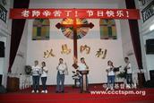 为庆祝第28个教师节,中南神学院学生会谢沐若等策划筹办、以“谢谢您灿烂的笑容”为主题的教师节联欢晚会,于2012年9月10日晚6点半在湖北省基督教感恩堂举行,中南神学院全体师生参加了这一活动。