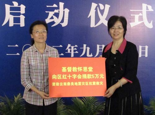 9月17日,上海基督教怀恩堂在参加区内首届宗教慈善周启动仪式上,心系云南彝良地震灾区民众,特向区红十字会捐款5万元,用以支援灾区重建工作。