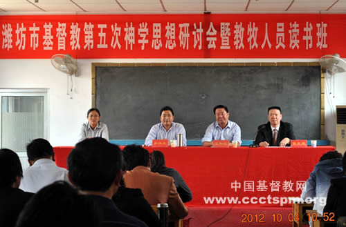 为了进一步推进神学思想建设,挖掘圣经中的时代亮光,按着正意分解真理,鼓励引导广大弟兄姊妹力尽社会责任,关爱周围众人,在构建和谐社会的见证中为基督作美好见证,2012年10月4日至6日,山东省潍坊市基督教两会在培训中心举办了以“爱国•和谐•奉献”为主题的第五次神学思想建设研讨会暨教牧人员读书班。