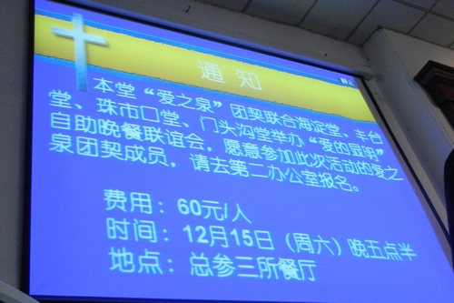 据北京市基督教缸瓦市堂11月18日主日活动通知,缸瓦市“爱之泉”团契将于12月15日(周六)晚上五点半联合北京市海淀堂、丰台堂、珠市口堂、门头沟堂在总参三所餐厅举办“爱的显明”自助晚餐联谊会。