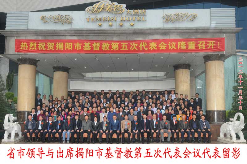 广东省揭阳市基督教第五次代表会议,于2012年11月30日在揭阳市区召开,出席本次会议代表118人。这是揭阳市基督教界一次盛会,大家欢聚一堂,共商揭阳市基督教发展和振兴的大计。