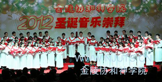 2012年金陵协和神学院圣诞音乐崇拜于12月21日19时在院礼堂举行。本次音乐崇拜分为包括“预言与成就:基督降生”、“欢呼与归荣:欢庆圣诞”的两部分乐章。陈逸鲁常务副院长做欢迎致辞并祷告,包括金陵协和神学院大诗班、小诗班、金陵喜乐敬拜团、江苏省交响乐团室内乐团等参与了本次音乐崇拜,以传统曲调演奏赞美诗的古筝独奏、弦乐重奏、男女生二重唱、合唱等节目都使人们留下了深刻的印象,崇拜的声音继续,赞美的歌声悠扬,愿上帝纪念我们的崇拜与赞美。