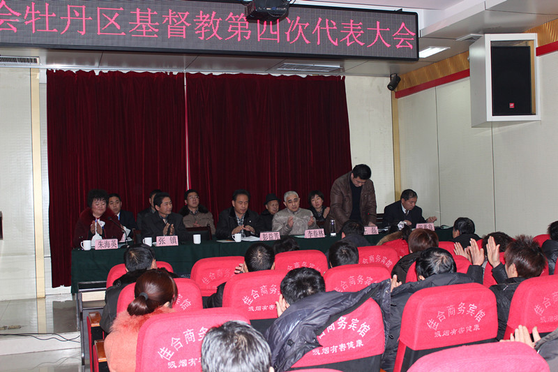 菏泽市牡丹区基督教三自爱国运动委员会于2012年12月29徦佳合商务酒店召开第四次代表会,会议有朱海英教师主持,张镇牧师做了“坚持三自原则创建‘和谐、复兴、属灵’基督教会”的报告。菏泽市统战部彭益芳副部长,牡丹区宗教局王磊局长,市基督教三自主席田素良牧师分别作了重要讲话。