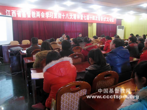 江西省基督教两会于2013年1月15日,在南昌市新建县心怡大酒店会议室举行“学习贯彻十八大精神报告会暨七届十四次常委(扩大)会”。会议邀请中共江西省委党校公共管理学教研部主任陈洪生教授作十八大精神专题报告。省基督教两会常委、各设区市负责人、省基督教两会员工、圣经学校师生约100人出席会议,聆听精彩报告。