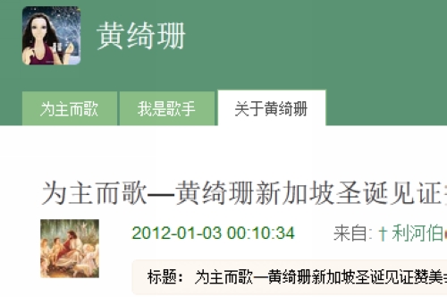 第二页是黄绮珊在《我是歌手》的参赛视频,而第三页“关于黄绮珊”中,则可以看到黄绮珊的信仰经历。在其婚姻生活和事业上其实都经历过许多坎坷,曾自杀未遂,03年当她再度萌生自杀念头的时候,通过一名基督徒艺人她开始认识主,04年受洗,受洗后最初几年其实并未认真认识主,中间也离开过教会,直到09年再度回转,生命才改变。当她改变后,她就决定为神而歌。(详情请见:为主而歌—黄绮珊新加坡圣诞见证赞美会访问记录)
