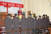 靖玖玮牧师、江祝林牧师、闫大卫牧师、郑 慧牧师、范晨光牧师(乌鲁木齐市基督教“两会”主席、会长)五位牧师行按手礼。新接立的八位牧师:陶荣玲(女佤族)、靖义成、王继荣(苗族)、普云善(女 彝族)、黄爱临(女)、李路军、张再亮(彝族)、司德勇(景颇族)。普云善牧师代表新按立的牧师致辞,感谢上帝的恩典,感谢信徒的帮助认可、感谢领导的关心培养;表示今后将忠心侍主,见证主名,荣神益人,做群羊的好榜样。最后由张再亮牧师祝福。