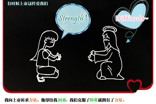 漫画中的一个场景是,一个小姊妹跪着向神祈求力量,在她对面的神向她敞开了双手,没有直接给她力量反而给了困难,因为神知道当她胜过了困难就有了力量。漫画中的困难是被一个大大的爱心包围着的,原来这个困难是神对人爱的方式。