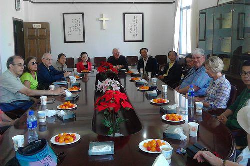 胡牧师向客人们介绍了武汉市基督教的基本情况。双方就教堂建设、神学教育、牧养事工、社会服务、农村教会等共同关心的问题进行了深入友好的交流。