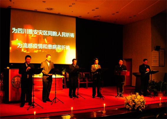 北京时间2013年4月20日8时02分四川省雅安市芦山县(北纬30.3,东经103.0)发生7.0级地震。消息传来,雅安同胞的安危牵动着每一位金陵学子的心,2013年4月21日晚,金陵协和神学院举行了全院师生烛光祷告会,大家为着雅安地震中的教会和同胞深切祈祷,同时为抵抗禽流感疫情及感染H7N9禽流感的患者祈祷。