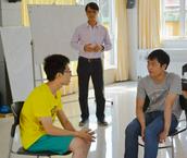 培训开始之前,同工们在督导的带动下玩起了动感十足的抛球热身游戏。同工们全情投入,青春本色展现无遗,换来轻松愉快的心情,为学习做了很好的预备。培训开始,蔡斌老师先抛出了 “你这么年青当社工,你可以帮到我吗?”、“如何真诚对待案主呢”等常见的社工问题,请同工思考作答。在督导的启发下,同工们踊跃回应,对社工的服务要点有了更加清晰的梳理,认识到社会工作专业背景和训练、端正的心态以及团队的支持能够让年轻社工有信心和能力为案主提供帮助。在接待案主时,应注重挖掘案主的优点,与案主一同工作,寻求解决问题的途径。接下来,蔡斌老师让同工2人一组,尝试通过彼此聊天发现对方的优点,此项练习不但让同工学到沟通的技巧,也增进了同事之间的相互认识与了解。