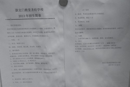 崇文门堂在教会的宣传栏内张贴了圣经学校的招生简章。从简章中可以得知,圣经学校的学制为一年,形式是周六全天授课,课程包括圣经类、教义类、历史类和实践类,学费为1000元(包括饭食、资料、讲义等费用)。
