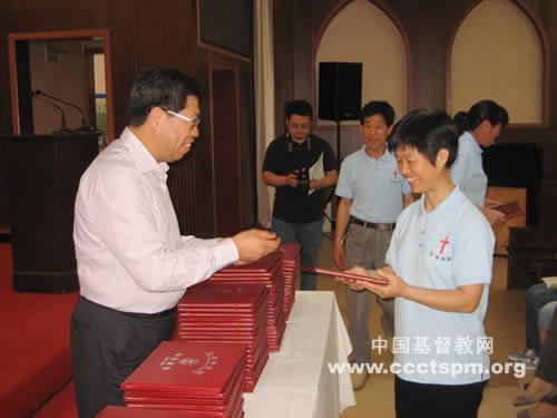 江苏神学院2013届毕业班,共有100位毕业生获准毕业,其中35位神学大专生、65位教牧大专生。院长张克运牧师为毕业生颁发毕业证书。