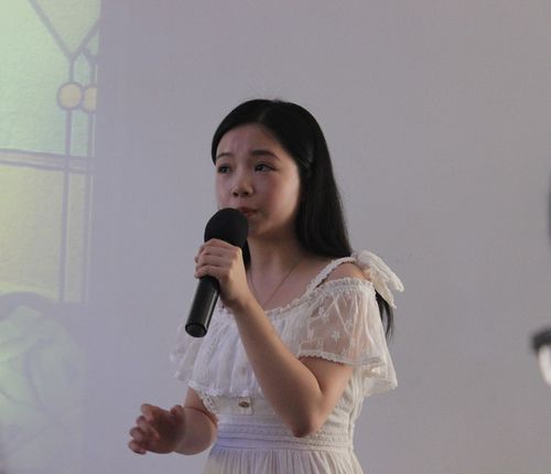 除了演唱,她还分享了自己关于阅读的生活和信仰对于她成长的影响,当被问到信仰对于这样一个年轻的女孩意味着什么的时候,她说信仰对于她很重要,就像生活中有一位父亲和亲密的朋友,他会听你说任何的话,知道自己可以得救感觉很开心。她特别分享了等待耶鲁大学的录取通知书的那个充满煎熬的过程,那时为自己和朋友的祷告给了她很多的力量,她不知道没有信仰会如何,每天的灵修和唱赞美诗的时间非常宝贵。
