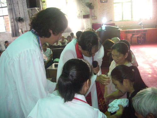 在诗班歌声中,接受洗礼的弟兄姊妹来到台前,关超英牧师为受洗的弟兄姊妹施洒水洗。牧师读了经文:马太福音16:16 “信而受洗的必然得救,不信的必被定罪”。罗马书 10:9 “你若口里认耶稣为主,心里信神叫他从死里复活,就必得救”。
