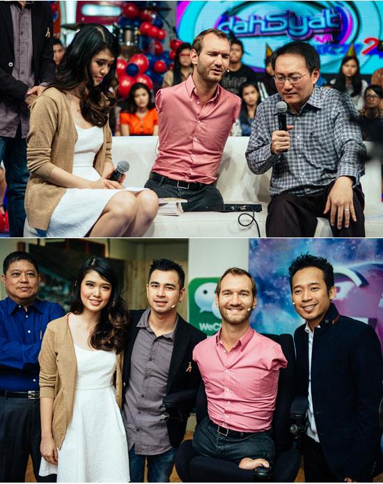 节目中,尼克胡哲分享自己的励志故事,并见证信仰在他人生中扮演的重要角色,印尼主流媒体都转播这一节目,至少两亿人收看到他的见证,这样的数字为无肢励志布道家尼克胡哲(Nick Vujicic)福音布道生涯画上了新的里程碑。