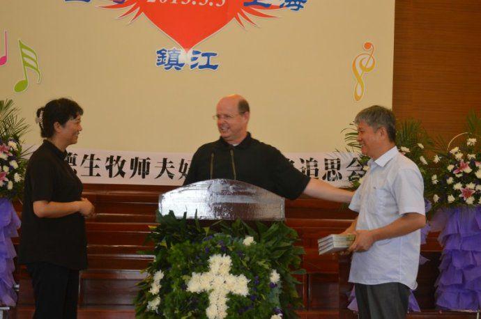 来自萧山教会的王老弟兄代表萧山教会分别向戴继宗牧师和尹素华牧师赠送了书籍,并为墓址迁移和钟楼建设做了专项奉献。