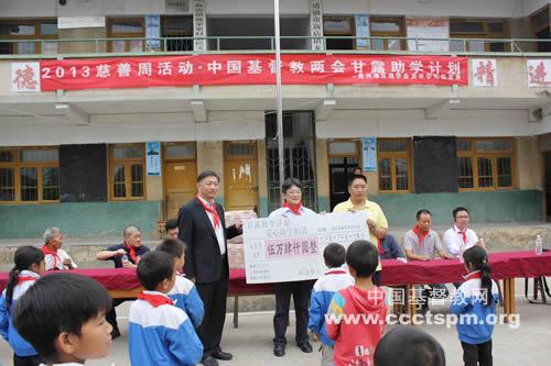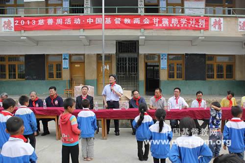 在中国基督教协会副会长、总干事(代)阚保平牧师的带领下,2013年9月23日,中国基督教两会社会服务部及上海国际礼拜堂主任刘斌牧师一行到贵州省贵阳市清镇市新店镇龙井小学,举行“2013慈善周活动•中国基督教两会甘露助学计划——贵州地区助学金及开学礼包发放”仪式。贵州省基督教两会杨朝云主席、罗应富秘书长等参加捐赠仪式。