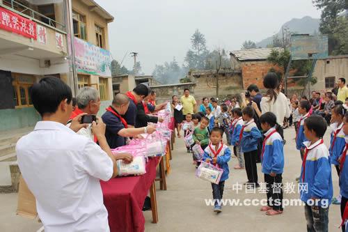 本次捐赠为龙井小学提供125份开学礼包,每份价值60余元,现金54000元,用于资助该小学30位家庭较贫困的学生,并现场发放给学生家长。新店镇副镇长杨秀华在致辞中对中国基督教两会对该镇教育事业的关心和支持表示感谢!并希望得到资助的龙井小学全体师生常怀感恩之心,树感恩之志,以优异的成绩回报社会,回报关心支持龙井小学教育事业的爱心人士。杨朝云牧师、刘斌牧师也分别作了发言,鼓励同学们好好学习,只有努力学习才能改变当前的现状,只有不断追求才能实现自己的梦想,只有不断进步才能不会被社会淘汰。阚保平牧师最后发言说:“要建设美丽中国,就包括偏远山区的美丽,不仅仅是自然风光的美丽,也包括经济发展美丽、文化基础美丽、生活环境美丽;要圆中国梦,就要树立梦想,希望每位小朋友树立自己的远大理想,向着标杆直奔,为实现中华民族伟大复兴而努力学习,成为祖国圆梦的追随者和建设者”。
