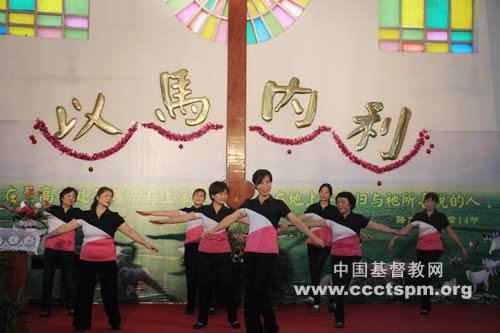 感恩堂心灵之光团契的弟兄姐妹虽然没有肉体上的眼睛可以看到神造的宇宙万物,但神给了他们美妙的歌喉,他们献唱诗歌《小路》和《举起救恩的杯》赢得了会众阵阵掌声。老年赞美队的姐妹们,以舞蹈《欢然取水》、《你的话是我脚前的灯》来表达她们对神的敬拜和尊崇。
