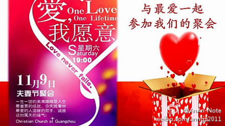 广州基督教锡安堂将于11月9日晚上7:30—9:30在副堂一楼举办夫妻节聚会,希望能将源自上帝的“11.11,一夫一妻.一生一世”的祝福带出。