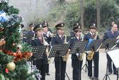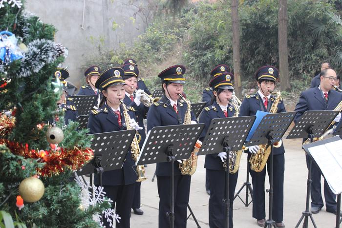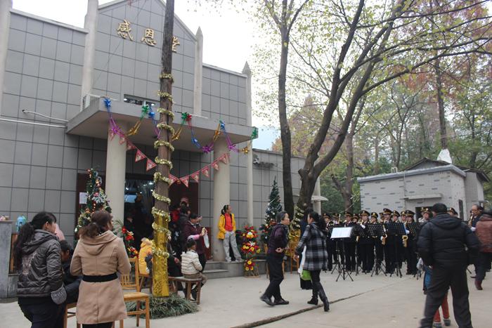 教堂门外,拉花,彩灯,圣诞树,花篮,乐队,一派喜庆。