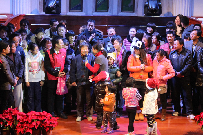 21日晚上,江湾堂,圣诞赞美会“爱的礼物”。五十多年了,一直看不到,王姊妹在感动中听完了这场音乐盛宴。牧师呼召时,她鼓起勇气站起来,“你想要什么礼物?”回答说:“平安”。